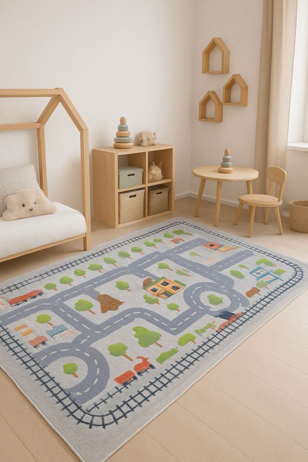Offrez à votre enfant un univers doux et stimulant avec ce magnifique tapis d’éveil aux motifs de ville. Conçu dans des tons apaisants et un style scandinave, il transforme la chambre en terrain de jeu grandeur nature. Routes sinueuses, rails de train, arbres, maisons et petites voitures invitent à l’imagination et à la découverte.